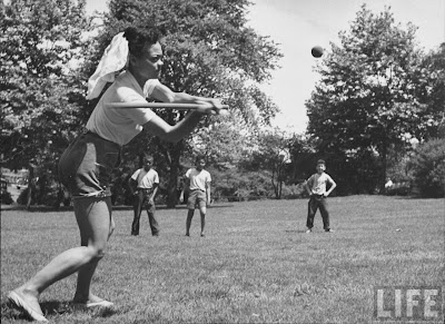 photo of singer Eartha Kitt playing stick ball in Central Park by Gordon Parks, 1952
