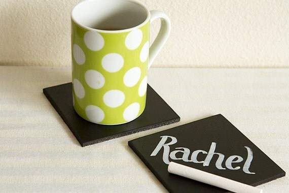 We threw a backyard party a couple weeks ago and our friend Genevieve brought us a cute host gift. She made her own chalkboard coasters -- what an awesome idea!